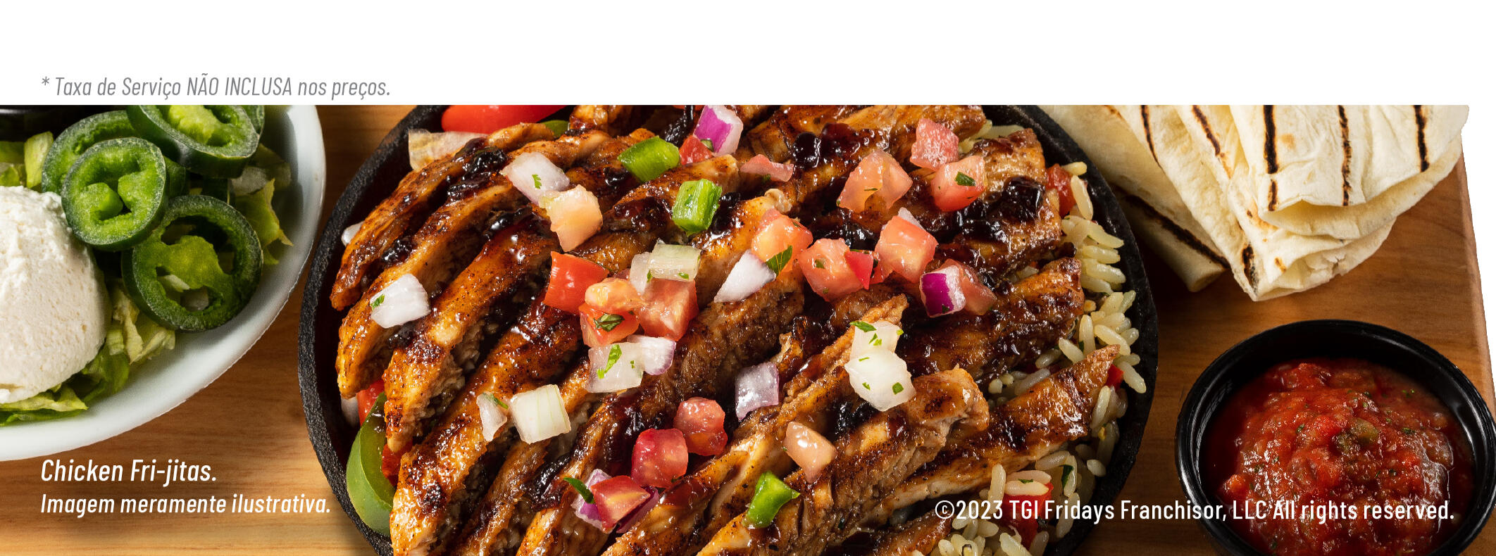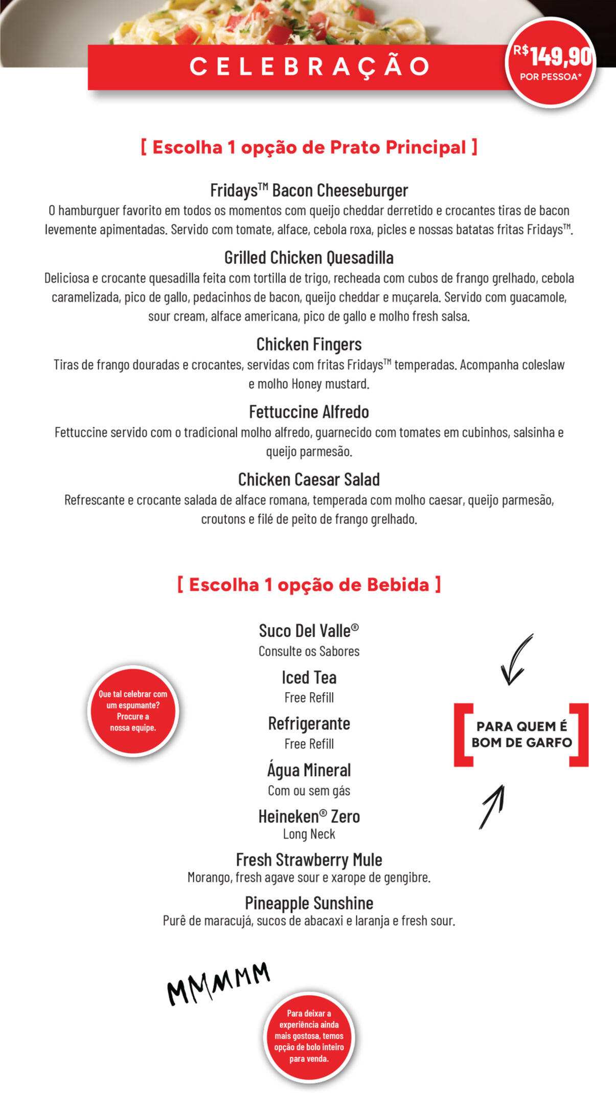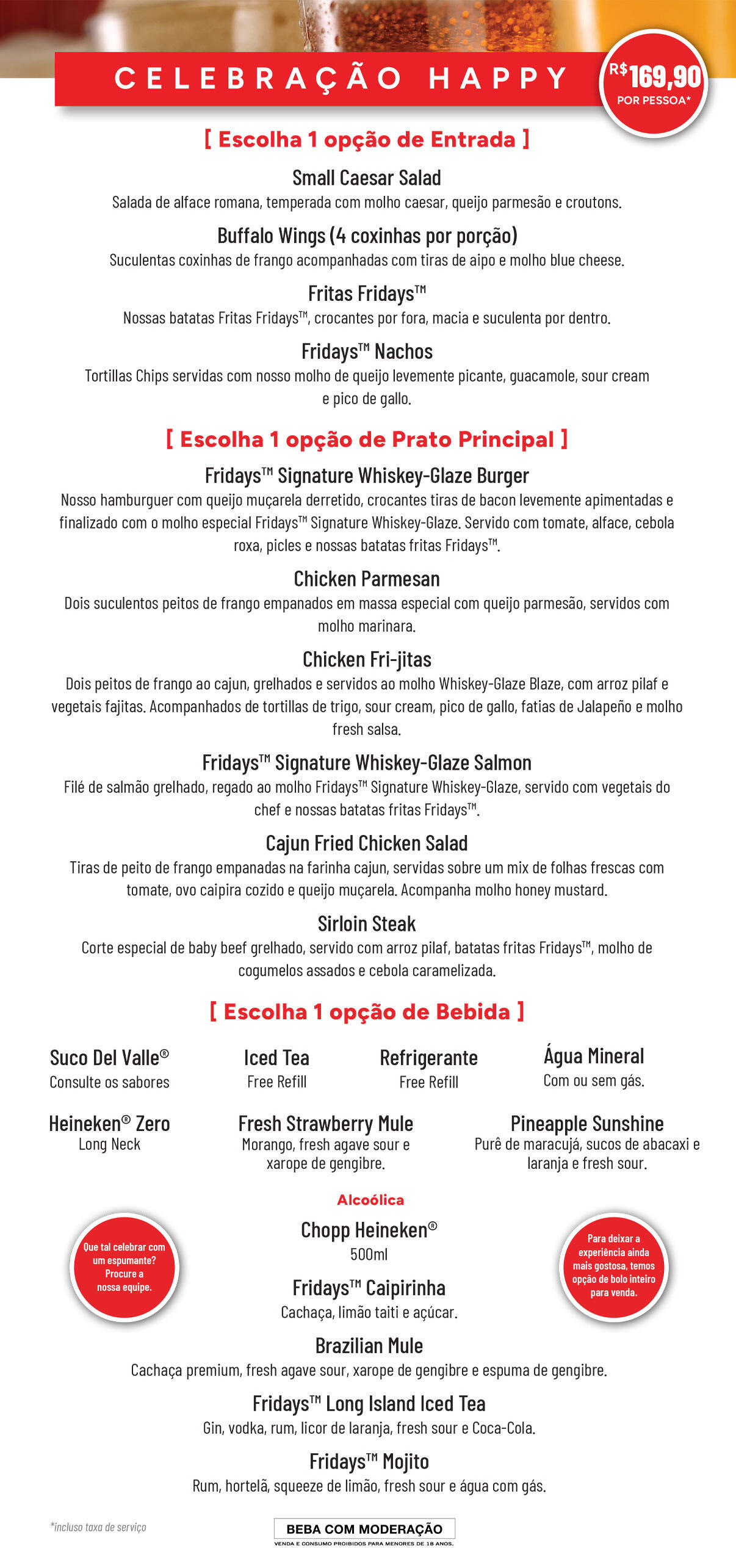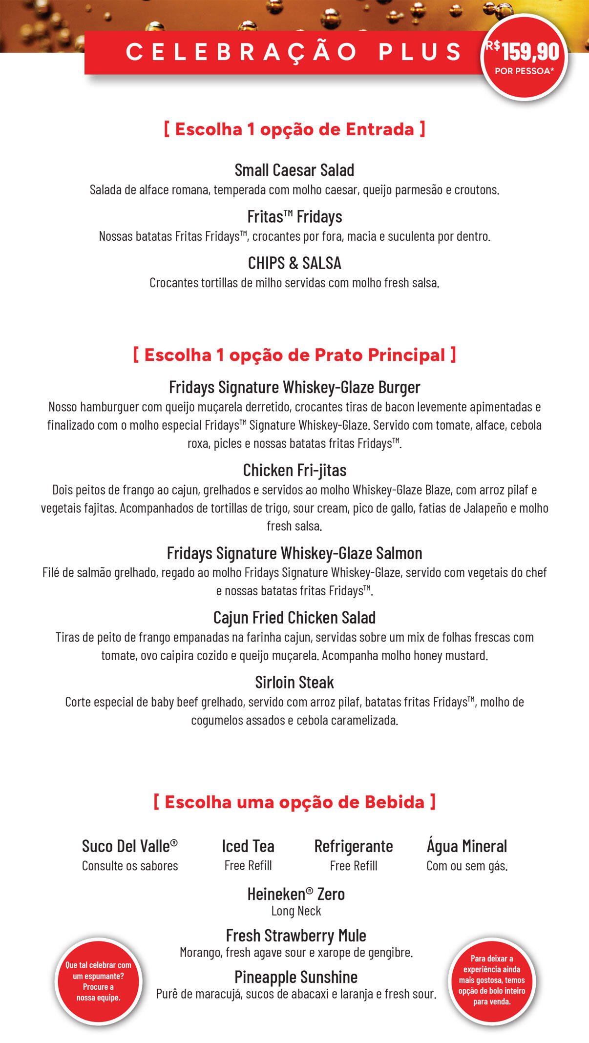©2025 TGI Fridays Franchisor, LLC All rights reserved. Imagens meramente ilustrativas.Menu exclusivo para reservas minimo de 10 pessoas. Verifique a disponibilidade com a equipe gerencial.Beba com moderação - Proibido bebidas para menores de 18 anos. Se beber, não dirija.